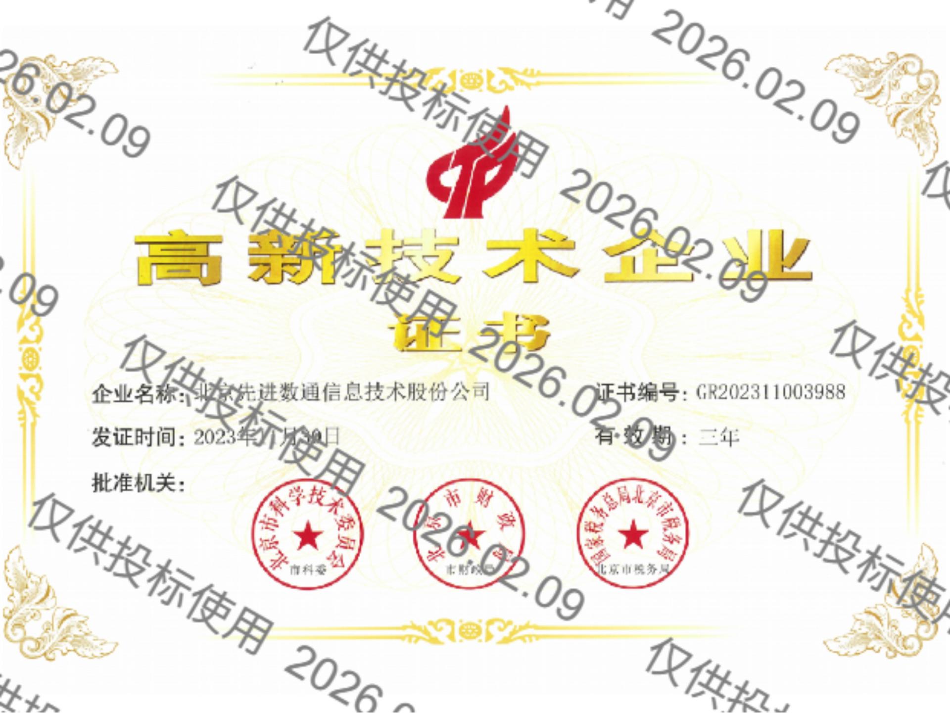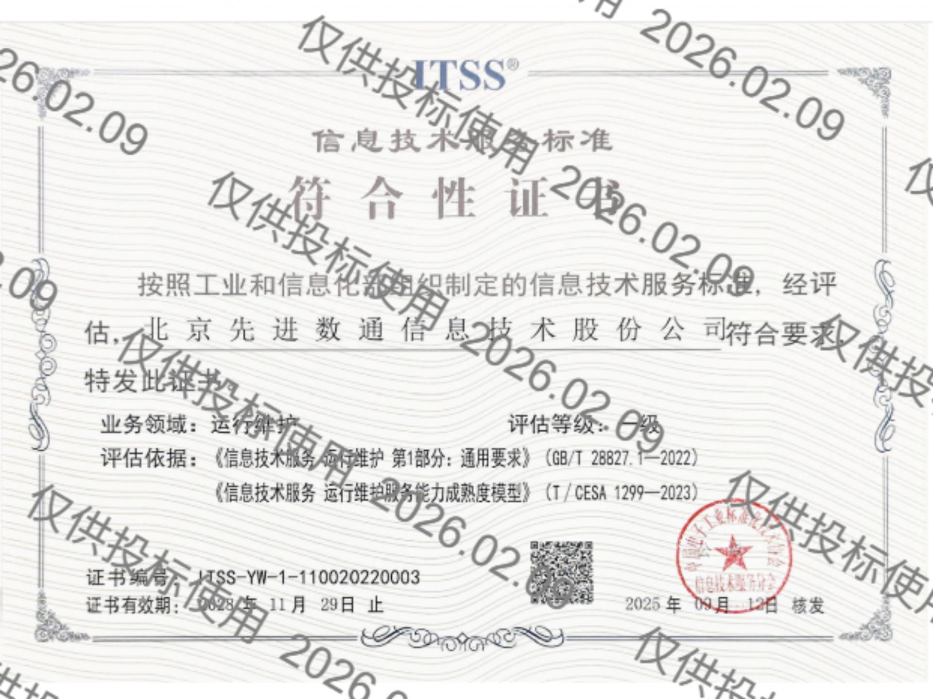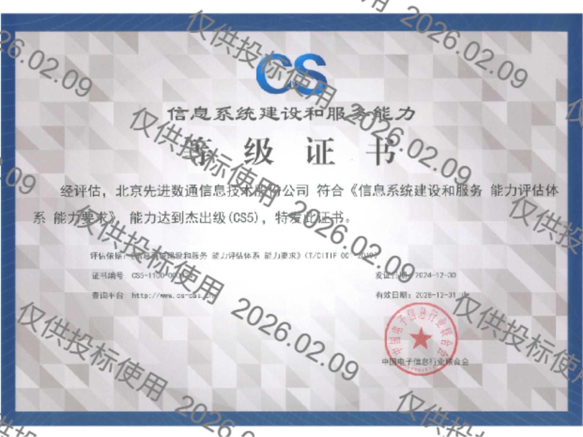 深圳商务先后取得CMMIL5、软件能力成熟度五级(SPCA 5)、信息系统建设和服务能力评估体系(CS)5级、ITSS成熟度一级、信息系统安全集成服务资质二级、信息系统安全运维服务资质二级、国产化信息系统集成和服务能力评估四级(LS4)、北京市企业技术中心等资质认证,并取得ISO9001、ISO20000、ISO27001、ISO14001、ISO45001、ISO22301、ISO37001、ISO28001、GBT29490等标准体系认证,具备行业领先的技术开发、工程实施及服务保障能力。